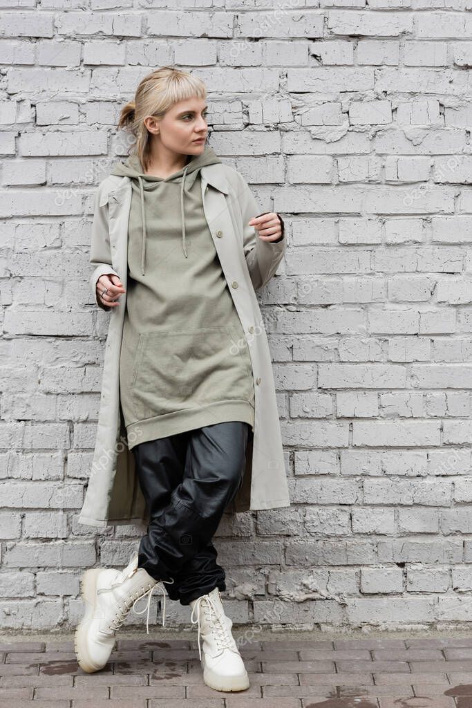 - модная молодая женщина с макияжем, светлые волосы, челка, в стильном наряде, длинная толстовка, пальто, черные кожаные брюки и бежевые сапоги, стоящие возле серой кирпичной стены и глядя в сторону