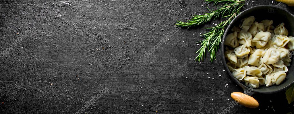 - Пельмени в кастрюле с розмарином. На черном деревенском фоне