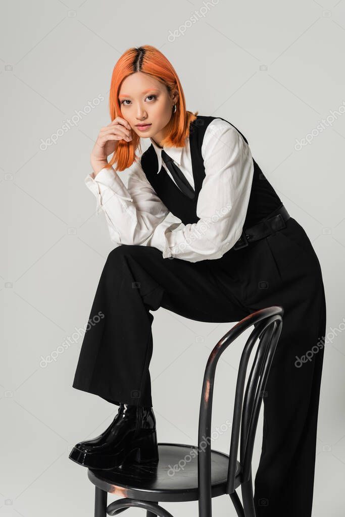 Современная азиатская женщина в модной черно-белой одежде, с цветными рыжими волосами позирует со стулом и смотрит на камеру на сером фоне, деловая повседневная мода, молодой стиль