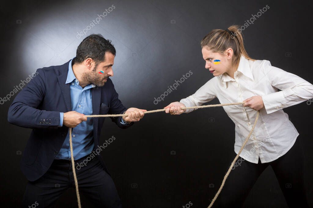 - Мужчина в куртке перетягивает канат против блондинки. Каждый из них стремится одержать верх над другим. Изолированный на черном фоне