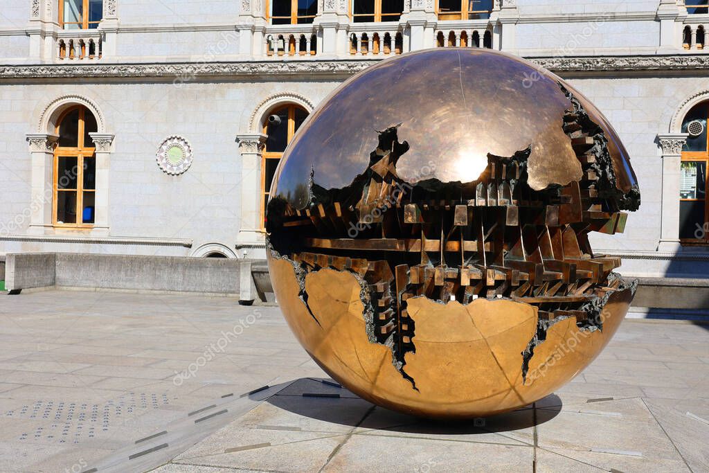 - DUBLIN REPUBLIC OF IRELAND 05 28 2023: On the podium of the iconic brutalist Berkeley Library is Sfera con sfera ('Sphere within sphere'). Properly part of Trinity College Dublin's Art collection