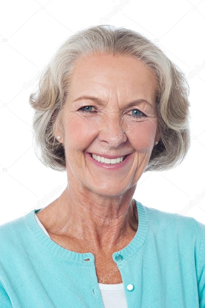Крупным планом зрелая женщина улыбается изолированно над белым