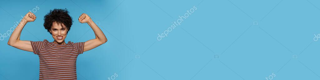 Молодая кудрявая брюнетка женщина улыбается и делает жест победителя изолированы на синем фоне