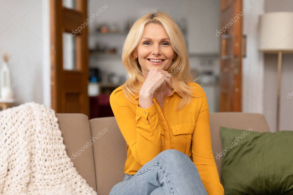 Портрет красивой блондинки средних лет, сидящей на диване и улыбающейся, глядя в камеру. Привлекательная дама в повседневной одежде расслабляется дома каждый день, наслаждаясь комфортом в выходные