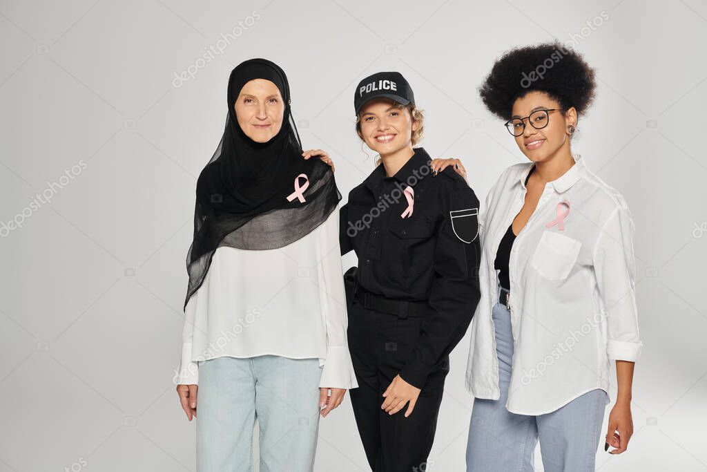 положительные и различные межрасовые женщины с раком молочной железы розовые ленты, изолированные на сером