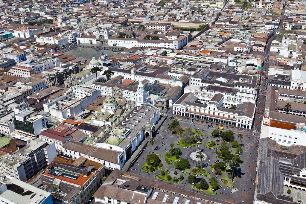 Вид с воздуха на колониальный город Кито, площадь Независимости, Дворец Правительства, Собор и площадь Сан-Франциско, Культурное наследие