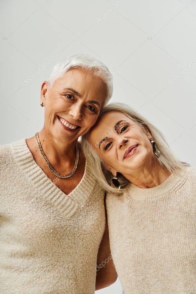 - портрет улыбающихся пожилых женщин в макияже и золотых аксессуарах, смотрящих в камеру на сером фоне