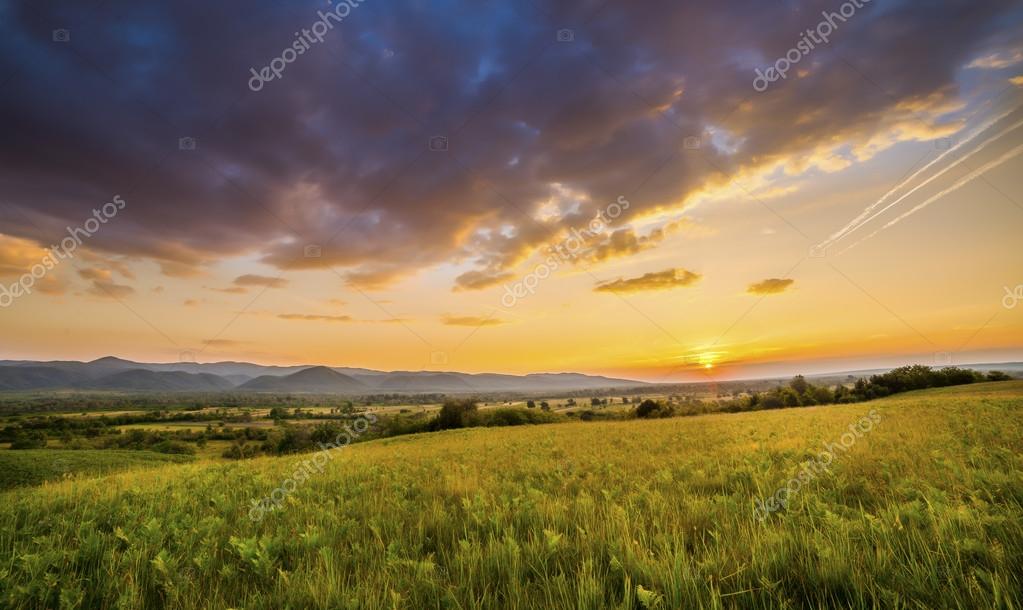 - Драматический закат над зеленым полем