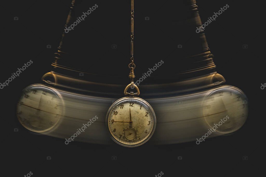 - Концепция гипноза. Старомодные карманные часы, раскачивающиеся в темноте. Гипноз.