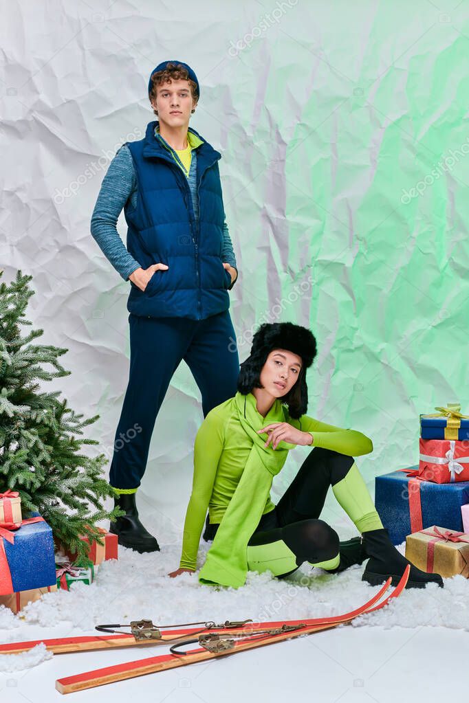 азиатка сидит на снегу в студии рядом с модным мужчиной, лыжи и подарки с рождественской елкой