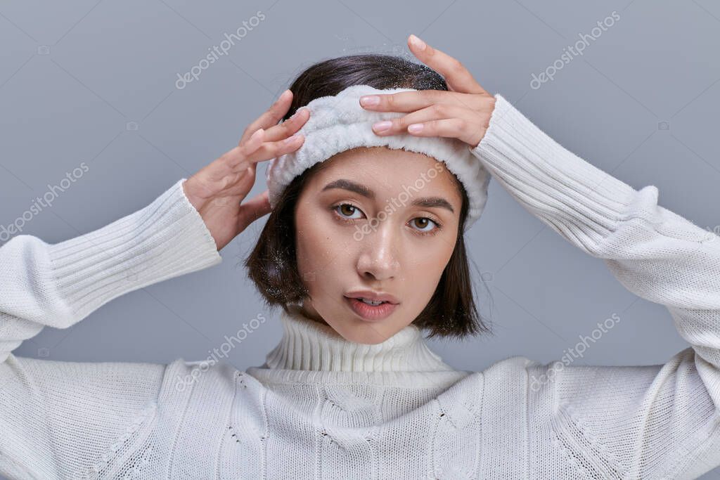 молодая азиатка в белом свитере, регулирующая мягкую повязку на серой зимней моде
