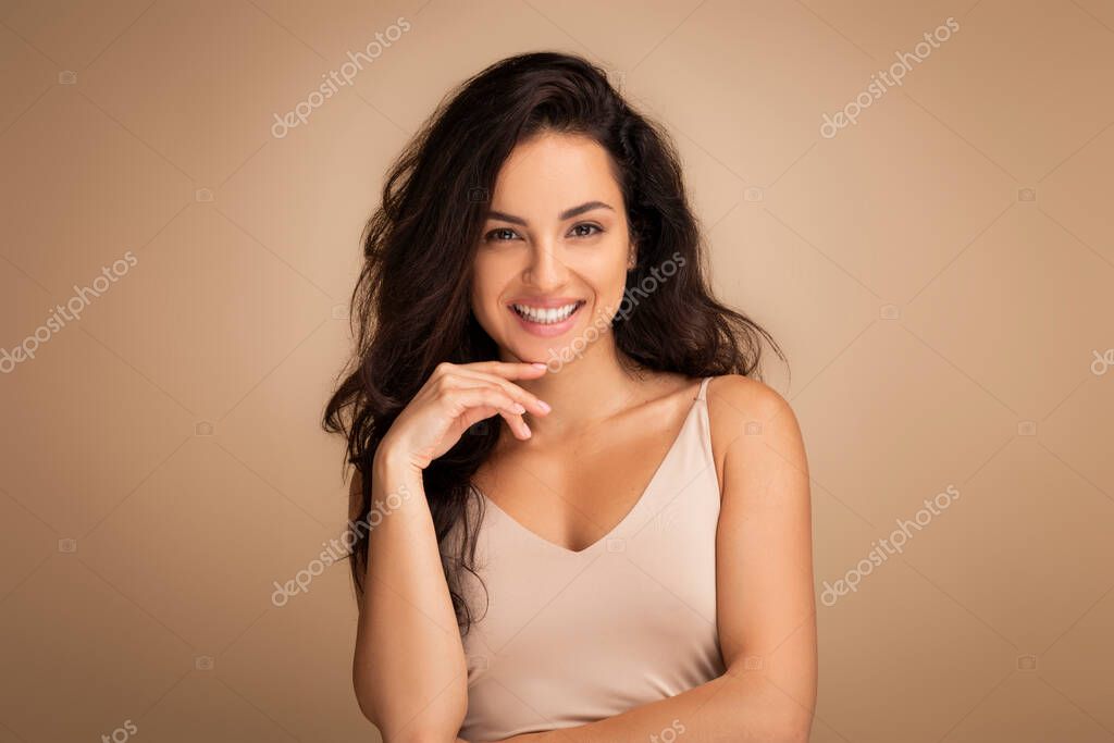 - Веселая брюнетка тысячелетнего Среднего Востока женщина демонстрирует свою природную красоту в изящной позе на бесшовном студийном фоне, показывая красивую кожу и длинные волосы