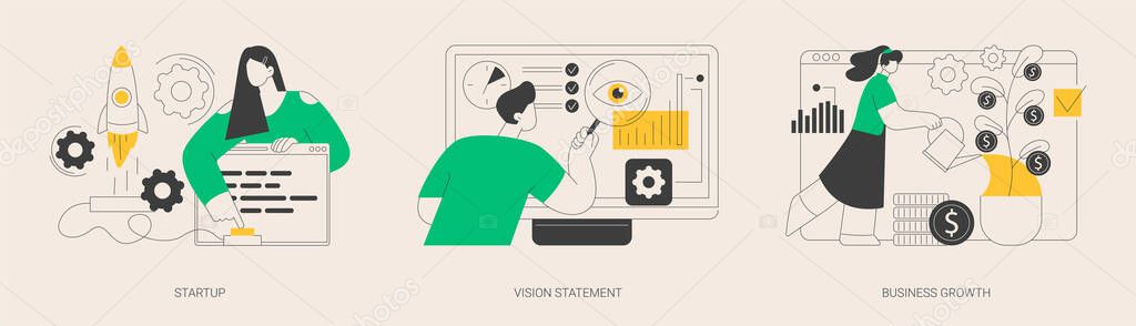 - Набор абстрактных векторных иллюстраций бизнес-идеи. Стартап запуск, видение заявления, рост бизнеса, будущие цели и задачи, успех бренда, предпринимательство абстрактная метафора.