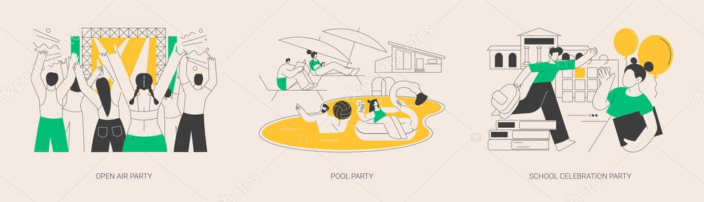 - Набор абстрактных векторных иллюстраций для планирования событий. Вечеринка в бассейне под открытым небом, школьный праздник, танцевальный открытый, летний музыкальный фестиваль, бассейн, приглашение на бал и оформление абстрактной метафоры.