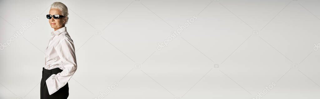 Стильная женщина средних лет в белой рубашке и солнцезащитных очках позирует с рукой в кармане на сером, баннер