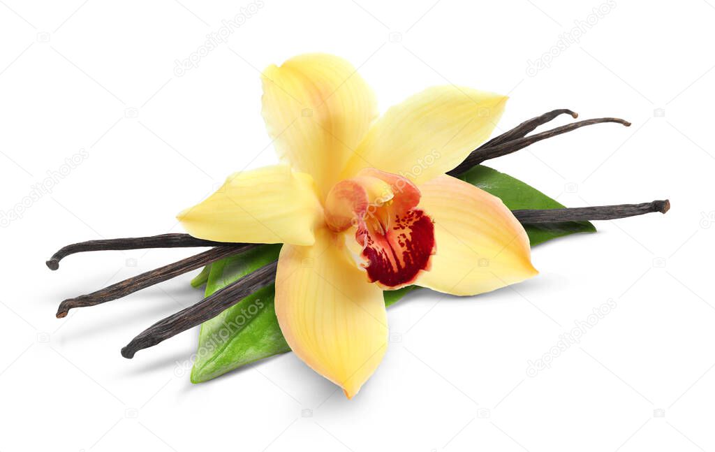 - Ванильные стручки, зеленые листья и желтый цветок изолированы на белом