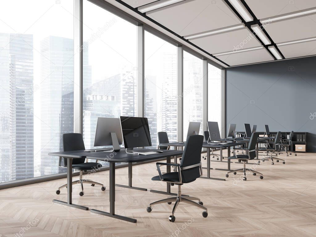 Угловой вид на современный офисный интерьер с компьютерами на столе в ряд, рабочее место с креслами и письменный стол на паркете. Панорамное окно на сингапурские небоскребы. 3D рендеринг