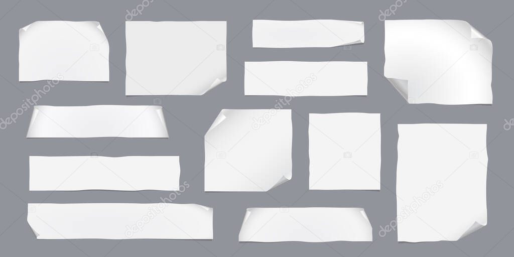 - Набор изогнутых белых полосок бумаги, листов ноутбука с твёрдой тенью, на сером фоне для текста, заметок, рекламы. Векторная иллюстрация.
