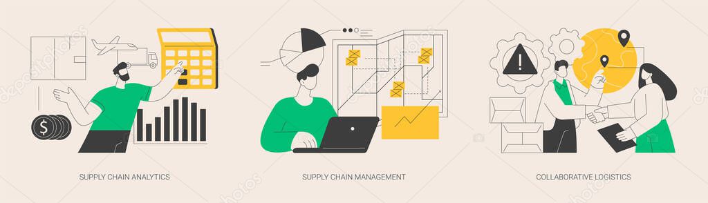 - Набор абстрактных векторных иллюстраций транспортной стоимости. Анализ и управление цепочками поставок, совместная логистика, доставка товаров, оптимизация затрат на грузоперевозки, абстрактная метафора хранения.