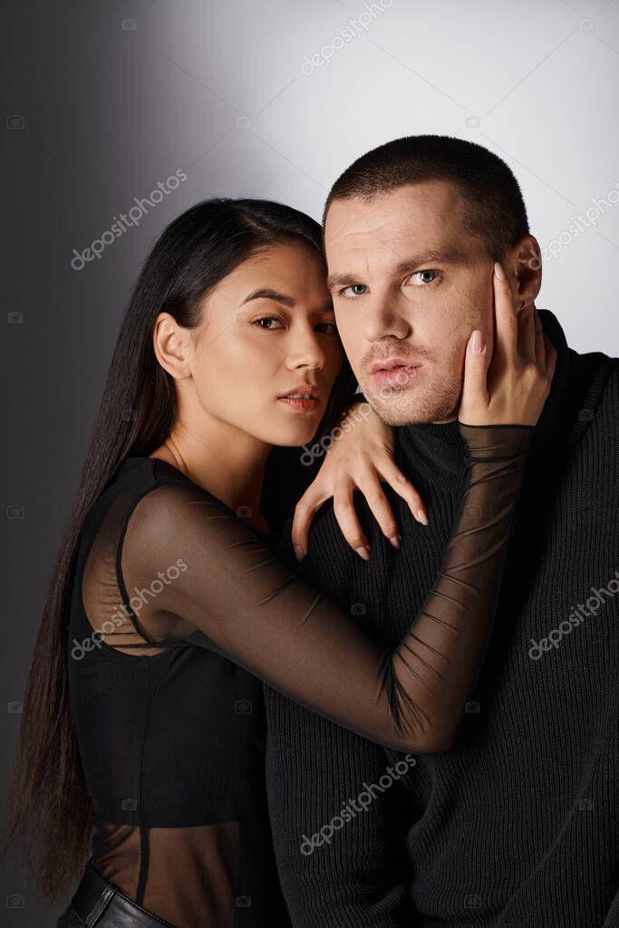 элегантная брюнетка азиатка в черной стильной одежде обнимает красивого мужчину на сером фоне