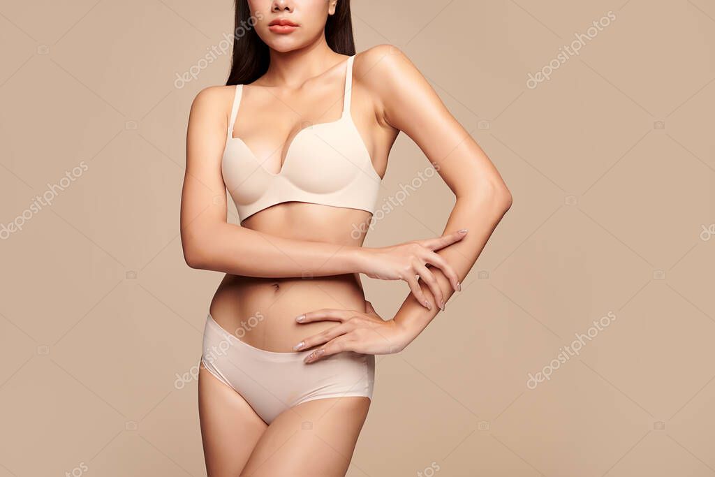 - Уверенная в себе красивая молодая азиатская женщина позирует в белом белье на бежевом фоне, идеальное тело,