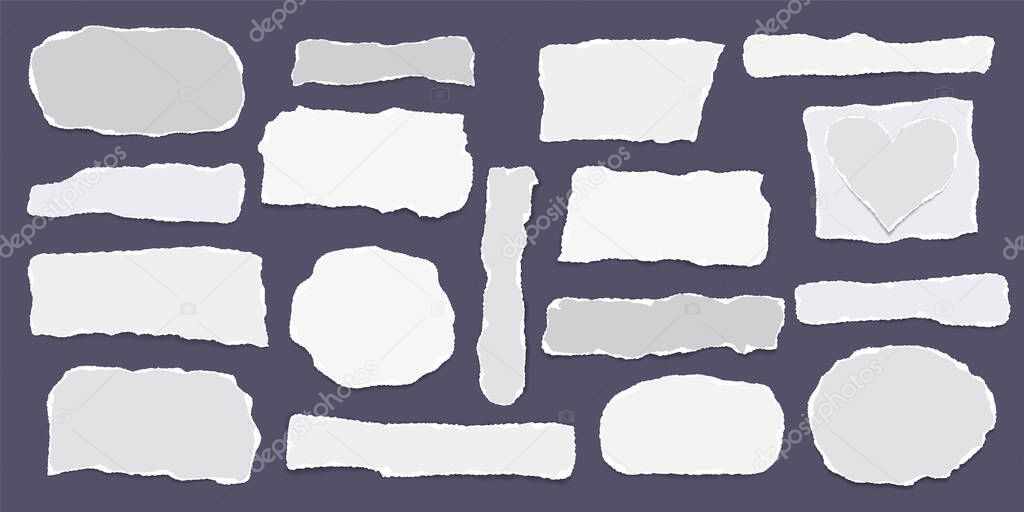 Набор разорванных, разорванных бумажных полос с мягкой тенью на черном фоне для текста или объявления. Векторная иллюстрация.