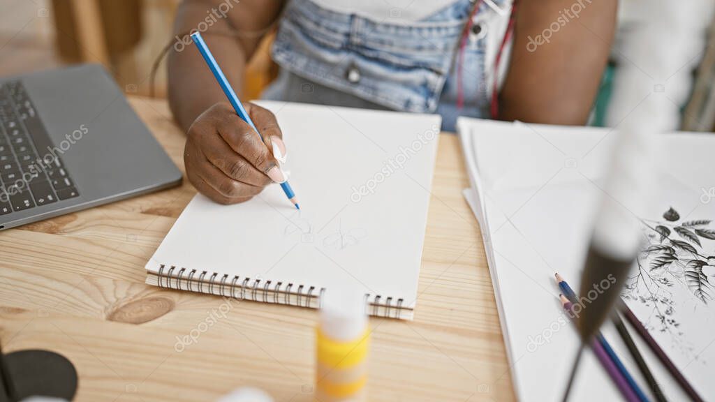 - В закрытой арт-студии женщина, африканская американская художница, страстно погружает руки в свой блокнот, выражая свой талант..
