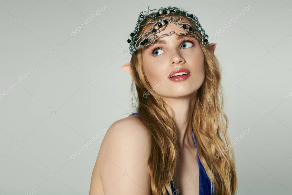 Молодая женщина в короне, олицетворяющая сказочную принцессу эльфа в причудливой студии.