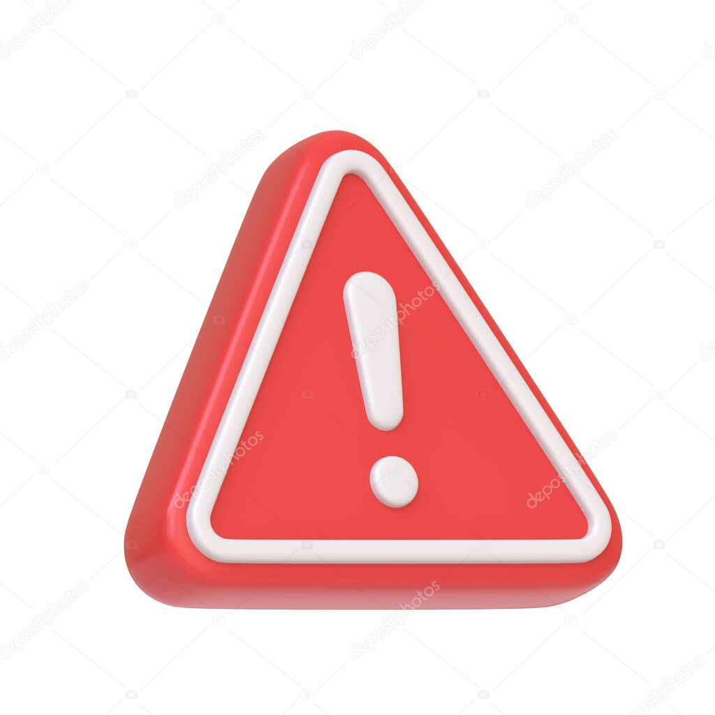 - Красный предупреждающий знак, содержащий смелый восклицательный знак, обычно используемый для оповещения о потенциальной опасности или предостережения, изолированные на белом фоне. 3D иконка, знак и символ. Вид сбоку. 3D-визуализация