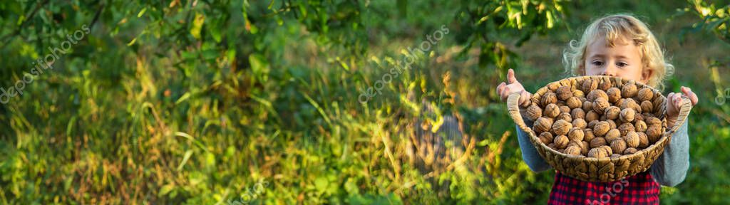 Ребенок собирает орехи в саду. Выборочный фокус. Еда.