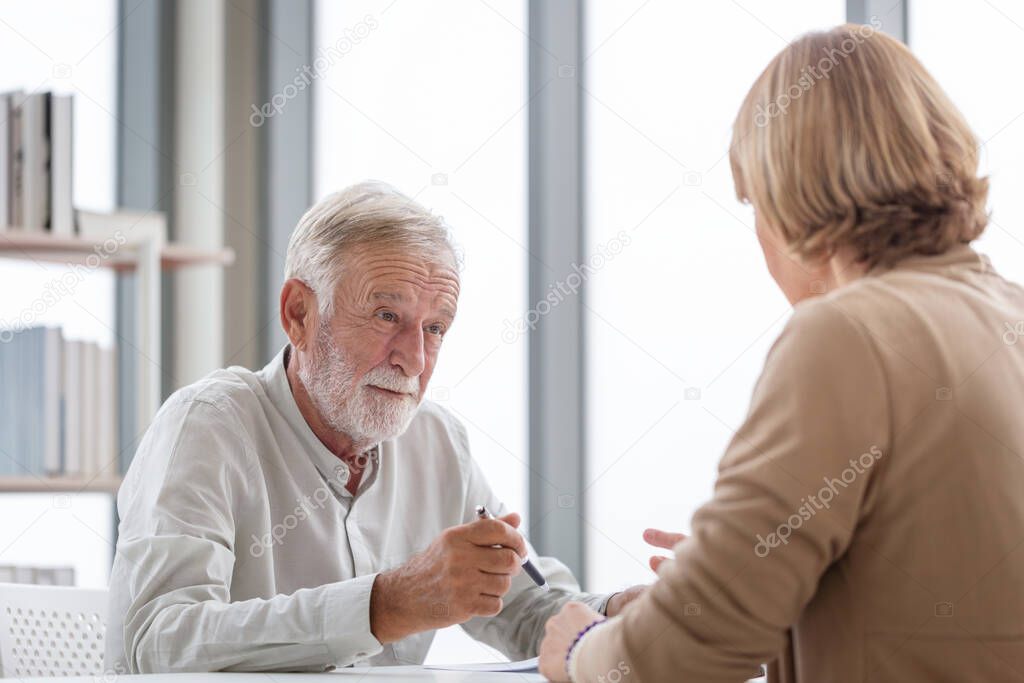 - Старший мужчина с ручкой и контрактом на подписание документов в кабинете врача, старший пациент заключает сделку медицинского страхования