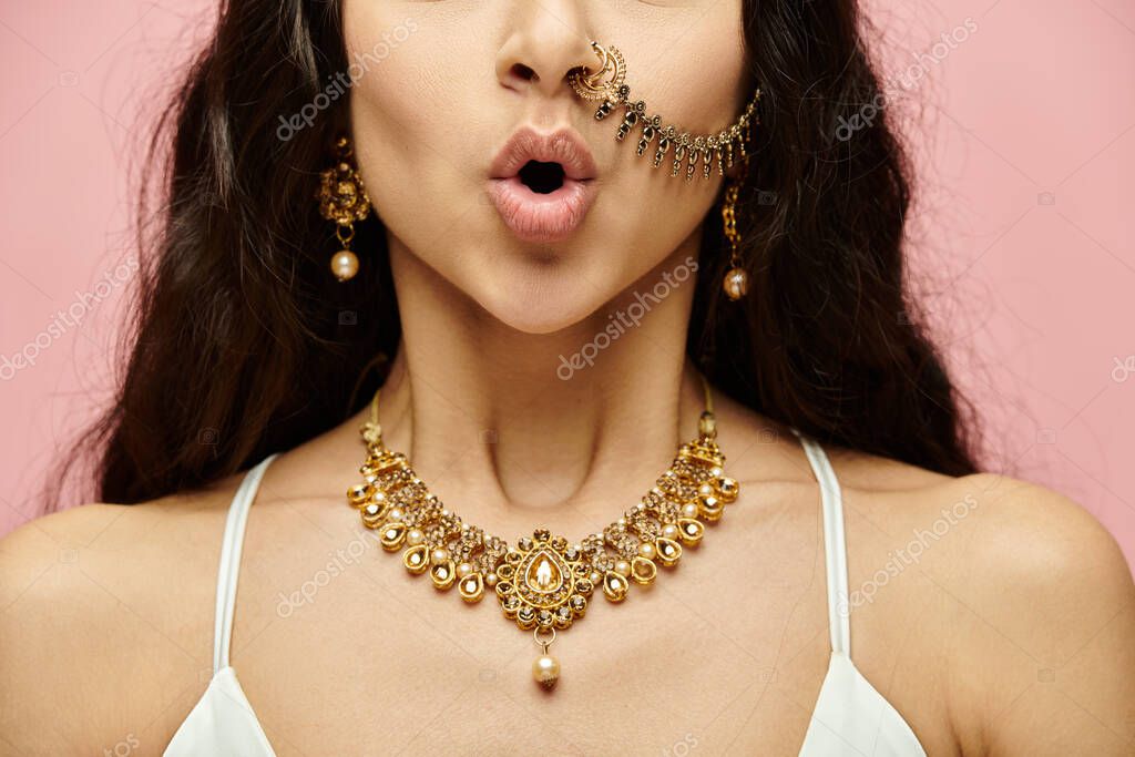 - Заманчивая индианка, украшенная золотыми украшениями, выставляет напоказ пирсинг носа..