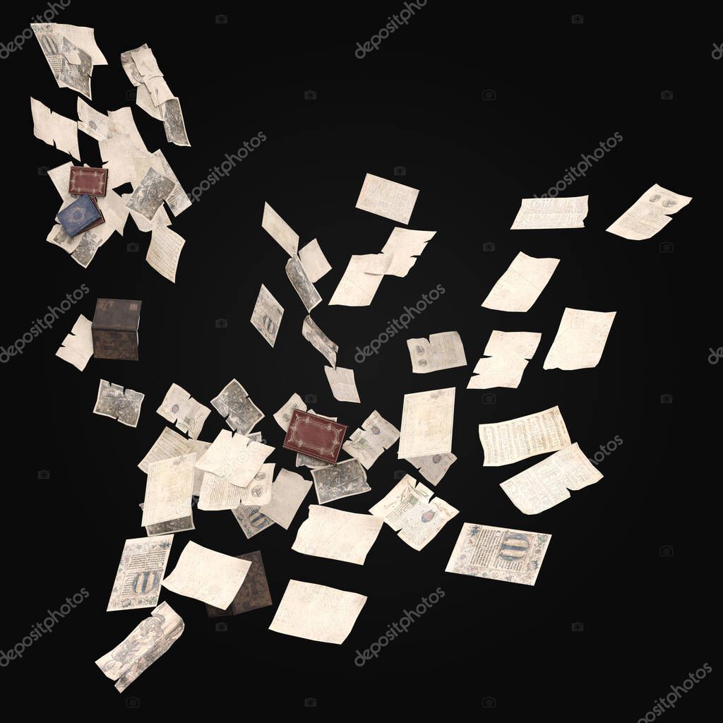 - 3D-рендеринг драматических волшебных страниц и летающей бумаги на тёмном фоне