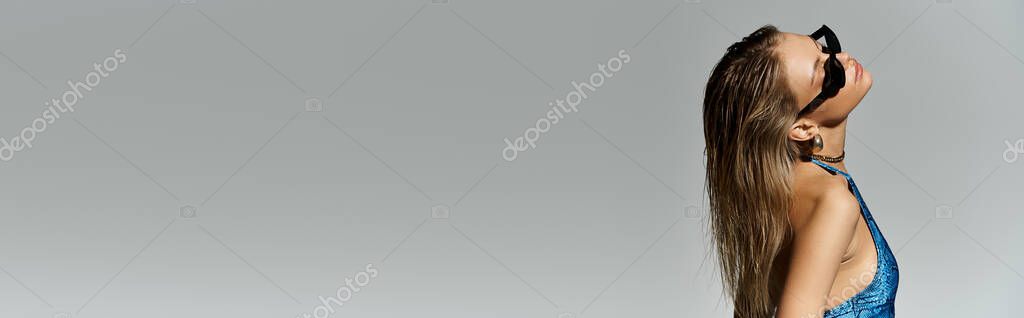 - Стильная блондинка позирует в синем купальнике на сером фоне.