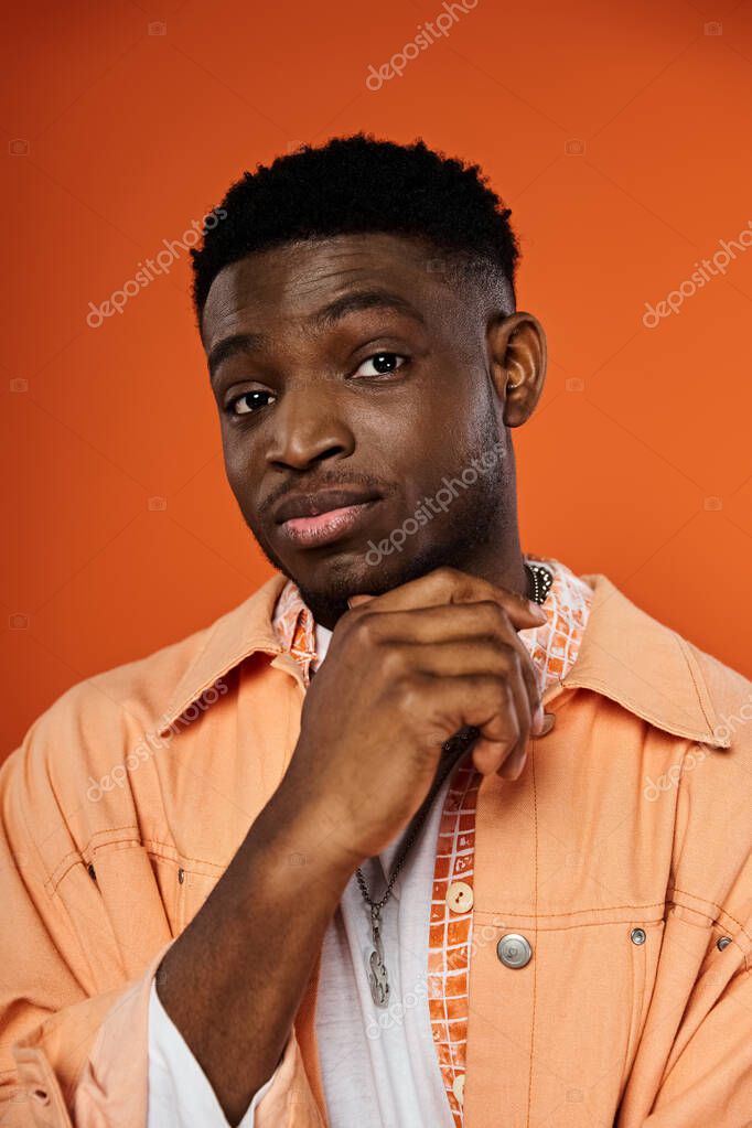 Стильный молодой человек уверенно позирует в яркой оранжевой куртке.