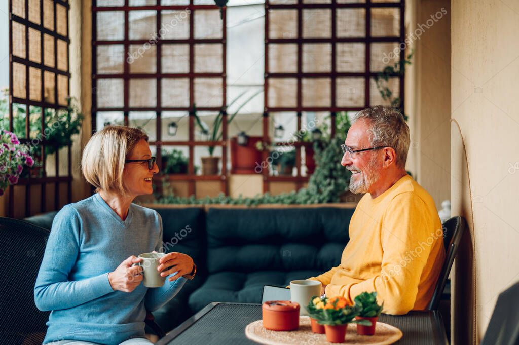 - Улыбающаяся зрелая пара разговаривает утром за чашечкой кофе на балконе или террасе. Пожилые люди любят концепцию. Наслаждайтесь пенсией. Смотрели друг на друга. Копирование пространства.