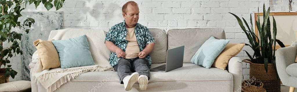 Мужчина с включённостью в узорчатой рубашке сидит на диване с ноутбуком и смотрит на экран.