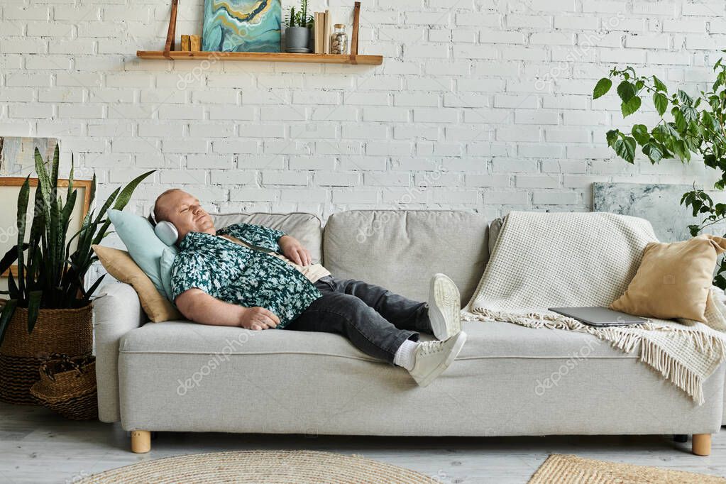Человек с инклюзивностью мирно покоится на сером диване, одетый в наушники и рубашку с узором.