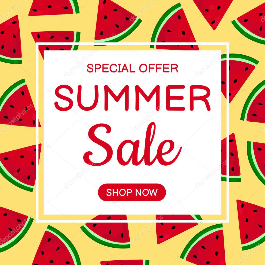 Шаблон баннера летней продажи. Ручной рисунок ломтиков арбуза. Векторная иллюстрация