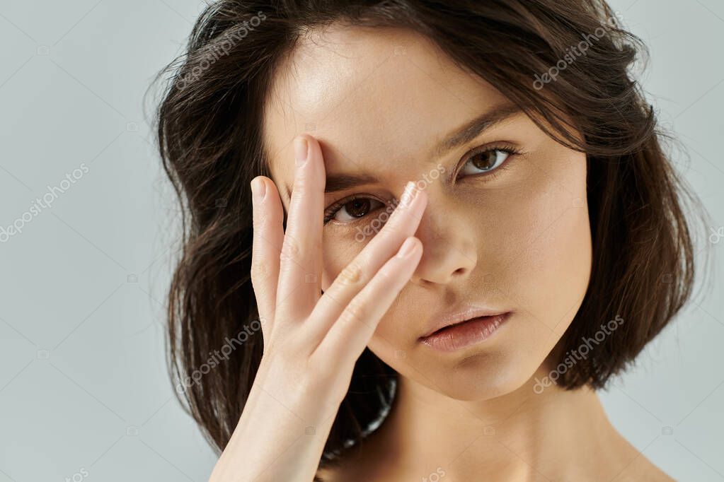 - Портрет крупным планом женщины с частично закрывающей лицо рукой.