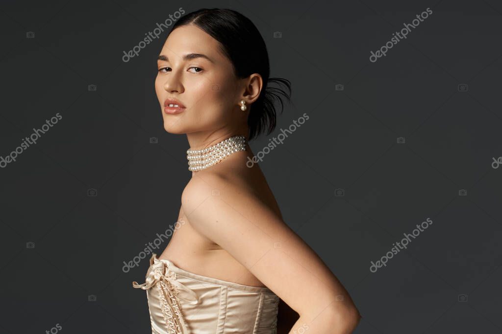 - Молодая женщина с брюнетками и жемчужным ожерельем, сфотографирована на тёмном фоне.
