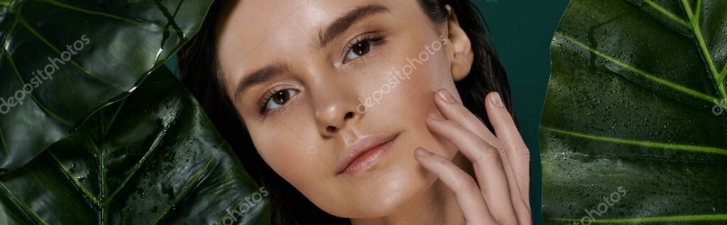 - Портрет крупным планом женщины с рукой на щеке, обрамленной яркими зелеными листьями.