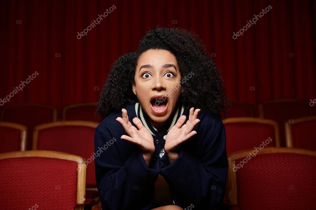 Черная женщина в повседневной одежде сидит в кинотеатре, руки подняты в шоке на сцене на экране.