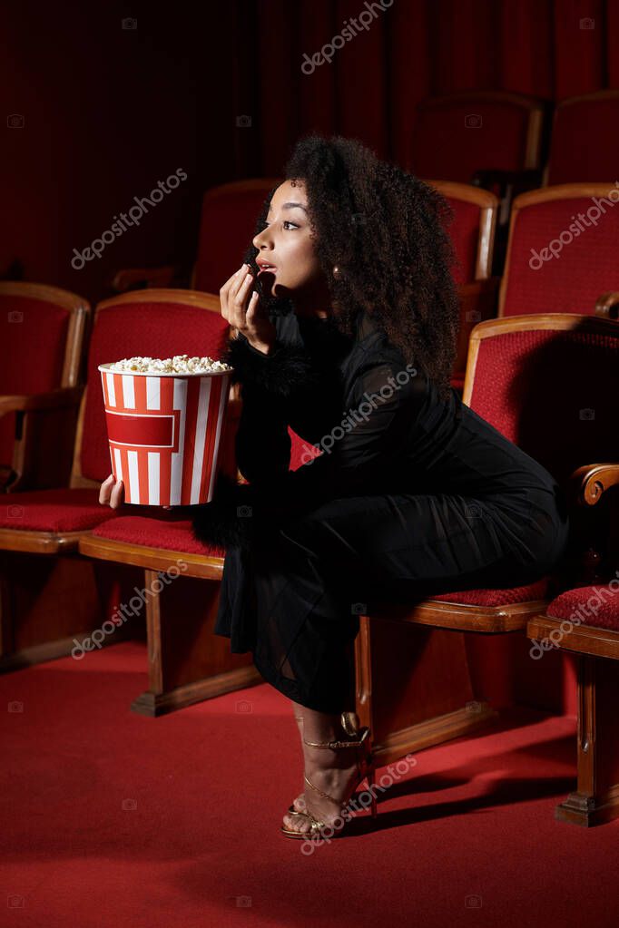 - Стильная женщина в черном платье наслаждается фильмом с ведром попкорна в тускло освещенном театре.