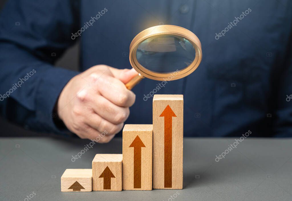 Бизнесмен с увеличительным стеклом изучает быстрый рост показателей. Экономические и статистические точки роста. Оптимистичный прогноз. Предпринимательство. Тревожная тенденция.