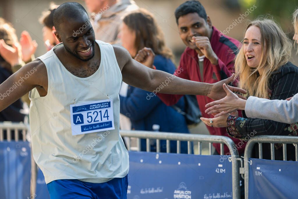 - Аудитория марафона хлопает в ладоши и аплодирует своим любимым, участвующим в гонке: бегун на марафоне с чёрным атлетом дает пять женщинам