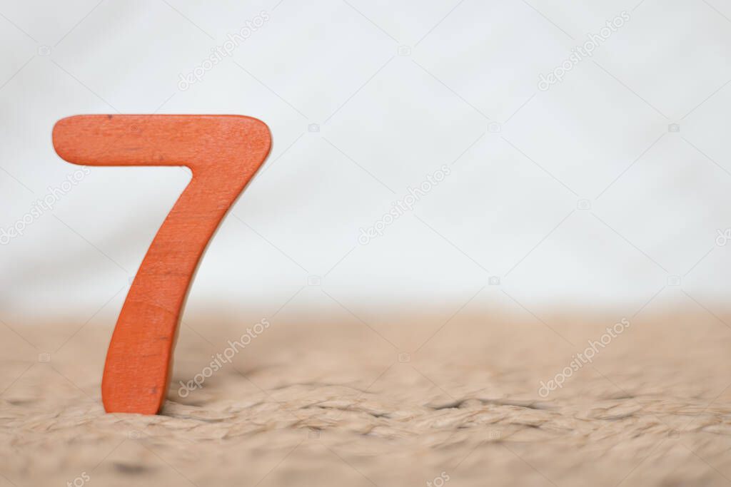 - Крупный план деревянная оранжевая цифра семь на белом размытом фоне, праздничная дата, юбилей, юбилейная открытка с копией места для текста