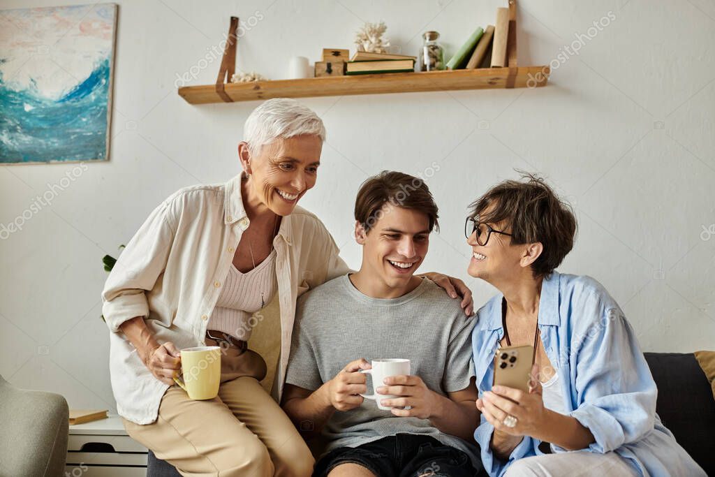 Две любящие матери и их взрослый сын разделяют смех и тепло в уютном жилом пространстве.