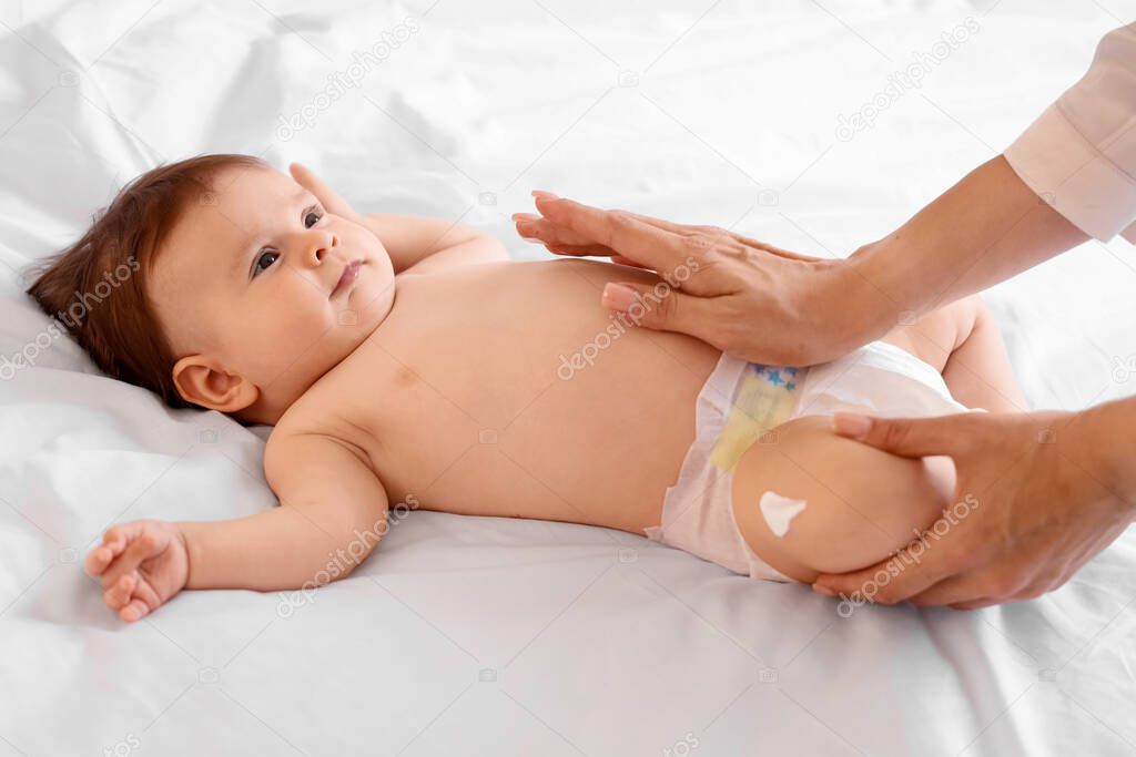 - Мама наносила крем на ногу малыша в спальне, крупным планом