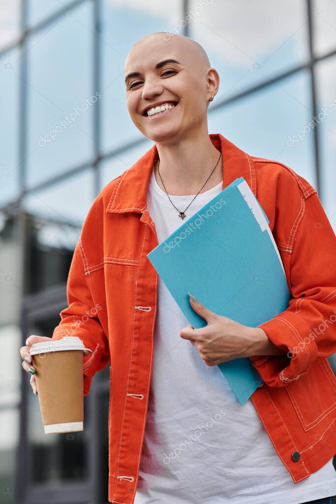 - Лысая женщина излучает радость, сжимая напиток и яркие папки под чистым небом.